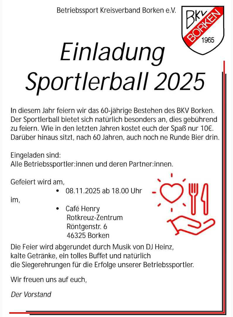 Zum diesjährigen Sportlerball des Betriebssport-Kreisverbandes Borken konnte der 1. Vorsitzende Lukas Ihorst 70 Gäste im Cafe Henry am DRK-Zentrum in Borken begrüßen. Nach einer Stärkung am Buffet wurden die Sieger und Platzierten des abgelaufenen Sportjahres geehrt.